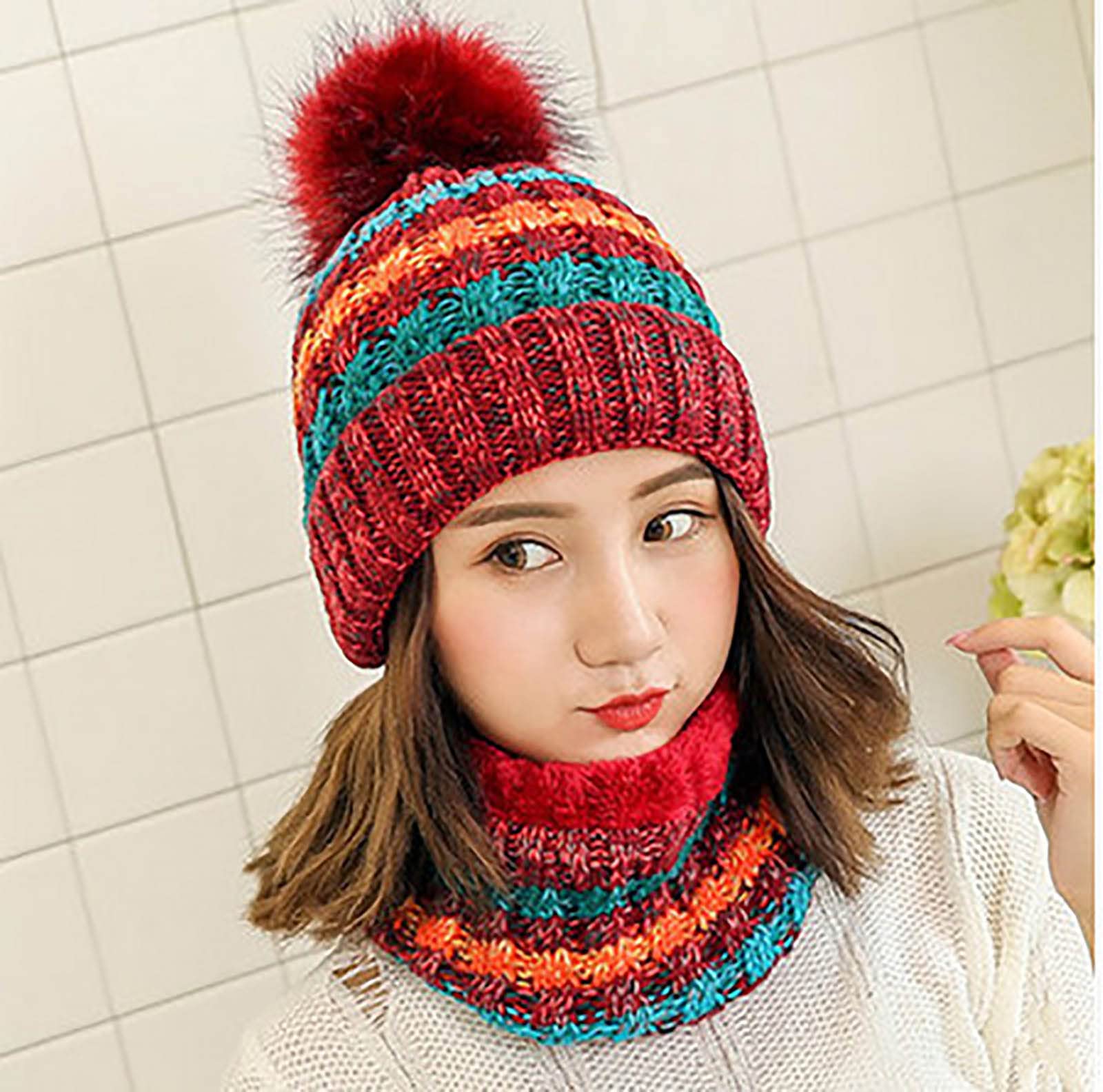 Rock88 Women S Knitted Hat Infinity Scarf Winter Ski Pom Poms Hats Simple Warm Striped Fashion Beanie Hat Thick Outdoor Cycling Cap Amazon De Fashion